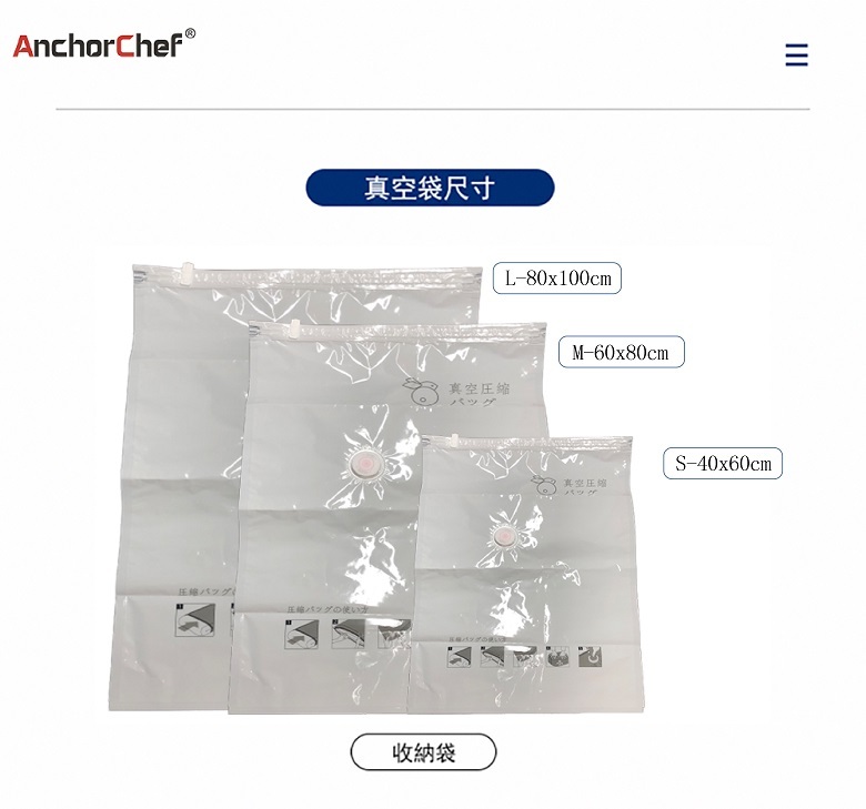 真空袋: 小S碼=40x60cm、中M碼=60x80cm、大L碼=80x100cm、特大XL碼: 110x100cm