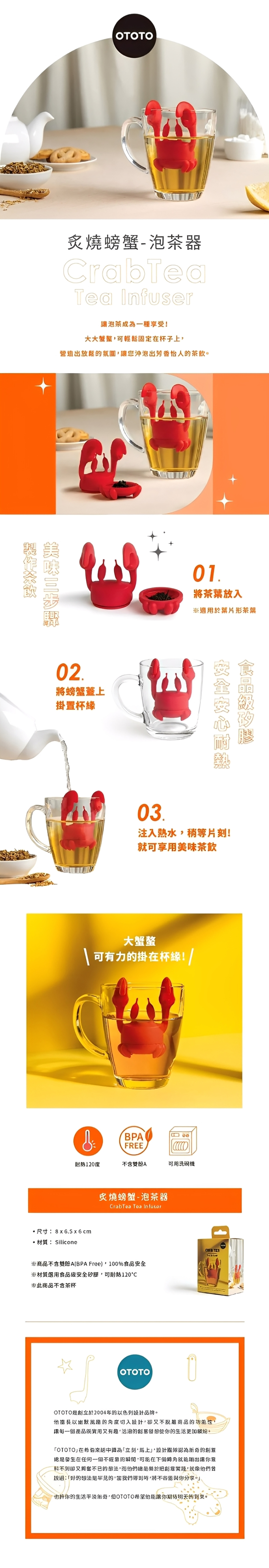 .大大蟹螯,可輕鬆固定在杯子上,營造出放鬆的氛圍,讓您沖泡出芳香怡人的茶飲。