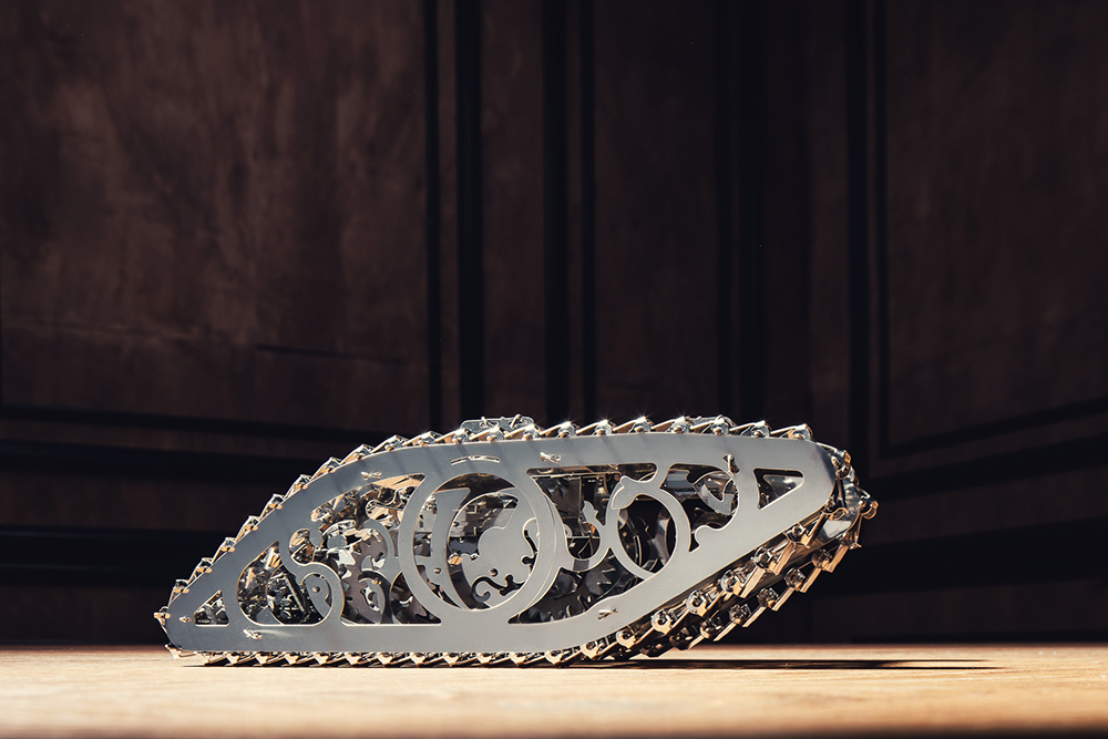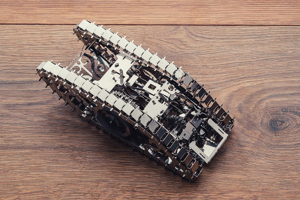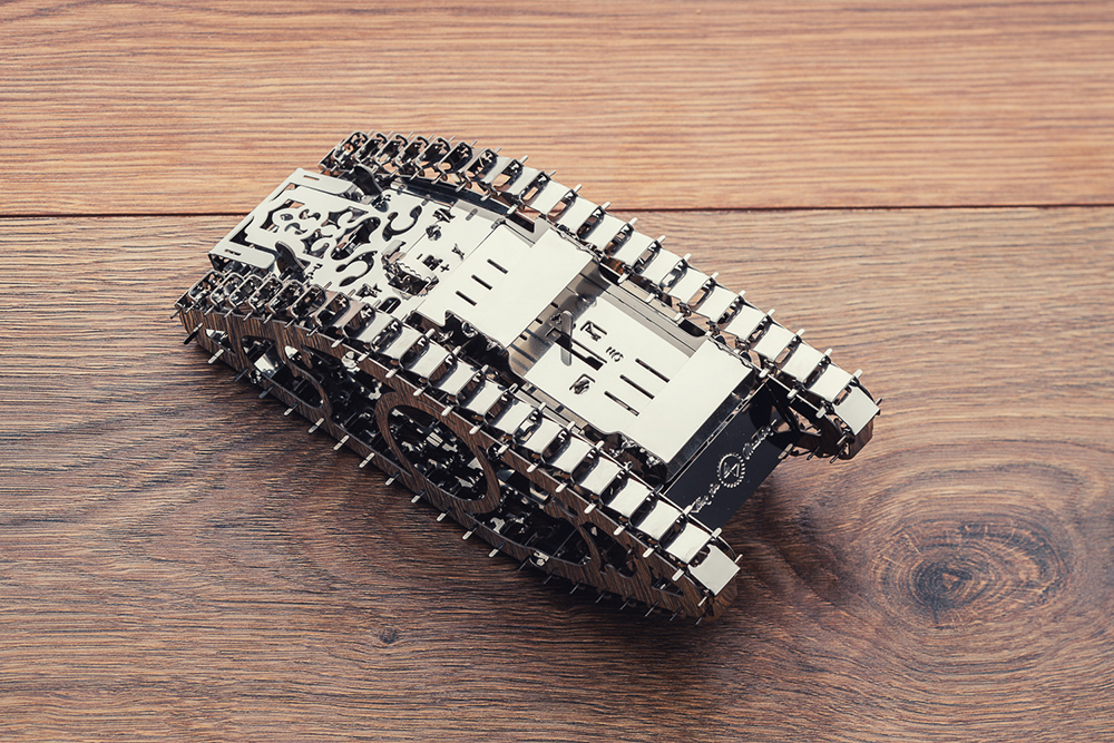 完成的成品不只帶給您滿滿成就感,光影下還閃耀著金屬榮耀光芒;撥動坦克上方縮小的控制桿,即可啟動金屬履帶的傳動裝置,整台坦克即可如沉睡獅子瞬間甦醒, 發出嘶吼聲向前俯伏無畏前進。更厲害的是,把它放在您桌上, 它就像真實坦克車一般,可在您的桌面翻山越嶺!!