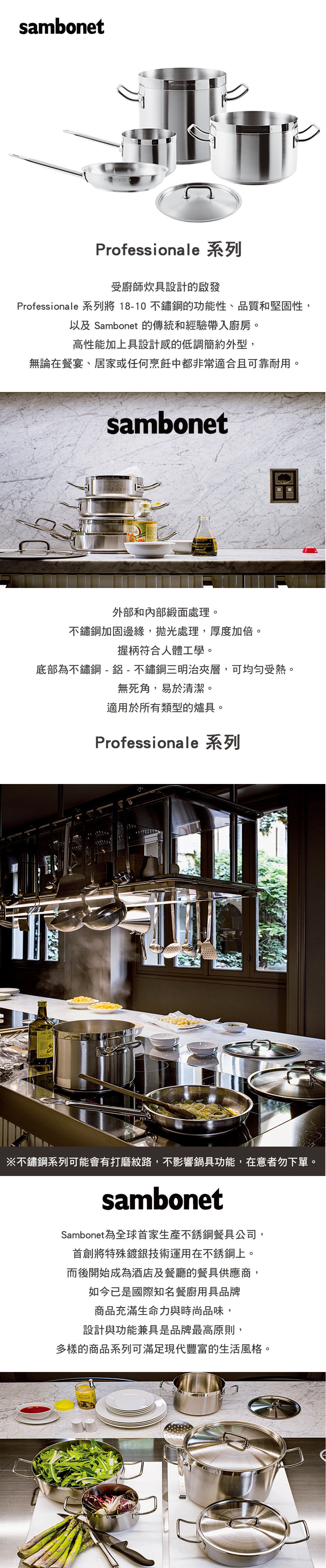 Sambonet打造義大利第一批工業電鍍產品,並開啓不鏽鋼扁平餐具生產的新時代。二十世紀初主要為貴族家庭提供商品和服務,自1980年以來不僅專注於陶瓷研究,並將工作技術個性化,不斷探索創新色彩方案,打造簡約形制。1997年,Sambonet加入Paderno集團(專業生產食品工業所需的炊具和廚房器具),因此,Sambonet能夠提供全套餐具和專業廚房器具。